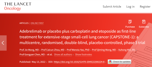 北京时间2022年5月14日,DG视讯医药自主研发的PD-L1抑制剂阿得贝利单抗治疗广泛期小细胞肺癌的III期临床研究(CAPSTONE-1研究)成果正式全文在线发表于国际权威学术期刊《柳叶刀·肿瘤学》(《THE LANCET Oncology》,影响因子41.316)。CAPSTONE-1研究结果显示,阿得贝利单抗联合化疗一线治疗广泛期小细胞肺癌相较于安慰剂联合化疗可以显著延长患者总生存期至15.3个月[1],刷新现有免疫药物一线治疗广泛期小细胞肺癌的总生存纪录[2]。