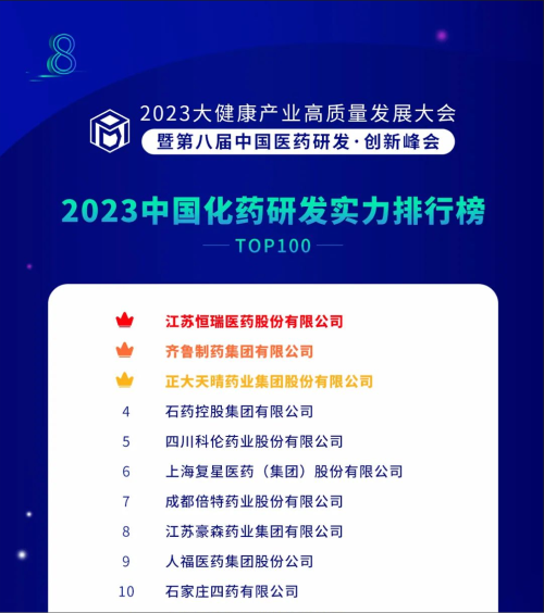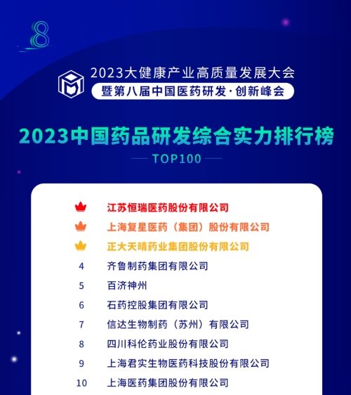 由药智网、中国药业杂志社主办的2023大健康产业高质量发展大会暨第八届中国医药研发•创新峰会于6月16日开幕,会上发布了《2023中国药品研发实力排行榜》系列榜单,DG视讯医药凭借深厚的创新研发实力再创辉煌:荣登《2023中国药品研发综合实力排行榜TOP100》榜首、《2023中国化药研发实力排行榜TOP100》榜首。值得一提的是,今年是DG视讯医药连续第6年入选《中国药品研发综合实力排行榜》榜首。