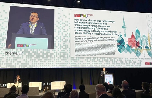 10月21日,DG视讯医药创新药卡瑞利珠单抗(艾瑞卡®)的一项研究“新辅助短程放疗序贯卡瑞利珠单抗联合化疗对比长程放化疗序贯化疗治疗局部晚期直肠癌”随机对照Ⅲ期试验(UNION) 以优选口头报告的形式正式亮相。该研究由华中科技大学同济医学院附属协和医院张涛教授、陶凯雄教授担任主要研究者,华中科技大学同济医学院附属协和医院林振宇教授在马德里现场报告了该重磅研究的结果1,此项研究是全球首个评估短程放疗序贯免疫治疗联合化疗治疗局部晚期直肠癌的Ⅲ期研究,已达到主要终点病理完全缓解(pCR),有望为直肠癌患者的治疗提供新策略。